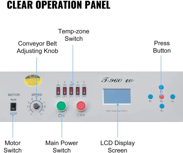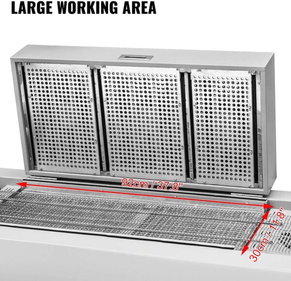- Vitesse de la bande transporteuse: 0-1500 mm / min / Temps de chauffe: 15 min