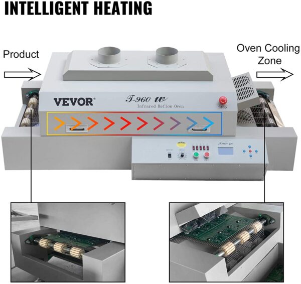 Le radiateur infrarouge T960W est un four à refusion contrôlé par microprocesseur. Cette machine utilise le sirocco de niveau intelligent et le contrôle de la technologie de chauffage infrarouge rapide, de sorte que la température est maintenue très précise et uniformément répartie. Il convient à la pâte à souder sans plomb à haute température de soudage et peut être utilisé pour souder efficacement divers composants SMT et BGA.