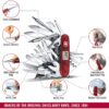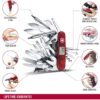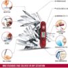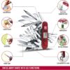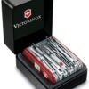 - Couteau de poche avec 83 fonctions, fabriqué en Suisse : cure-dents, stylo bille pressurisé, épingle, inox, montre digitale (12h), montre digitale (24h), minuteur, minuterie, altimètre (m), altimètre (pieds), baromètre, thermomètre (°C), thermomètre (°F), réveil, poinçon alésoir, ouvre-boîtes, tournevis 3 mm, décapsuleur, tournevis 6 mm, dénudeur de fils électriques, anneau, cle à fourche universelle M3, M4, M5, tournevis Phillips 1/2, loupe, pince multi-usages, coupe-fils métalliques, serre-cosses, bit case, clef porte-embouts, clef Hex 5 mm pour connecteurs D-SUB, clefs Hex 4 mm pour embouts, écailleur à poissons, dégorgeoir, mesure (cm), mesure (pouces), crochet multi-usages, lime à ongles, grande lame tranchant denté, poinçon alésoir, scie à bois, ciseaux, tournevis 25 mm, lame serpette, lame à cable, racloir de fils électriques, spatule pharmaceutique, lame ouvre-montres, tournevis 5 mm, cure-ongles, scie à métaux, lime à métaux, ciseau à bois 4 mm, grande lame, petite lame, tire-bouchon, petite-tournevis, embout plat 3, embout plat 4, embout Torx 6, embout Torx 8, embout Hex 12, embout Hex 15, embout Hex 2, embout Hex 25 mm, LED, embout Phillips 2, embout Phillips 0 (Pozidrive), embout Phillips 1 (Pozidrive), embout Torx 10, embout Torx 15, embout Hex 4
