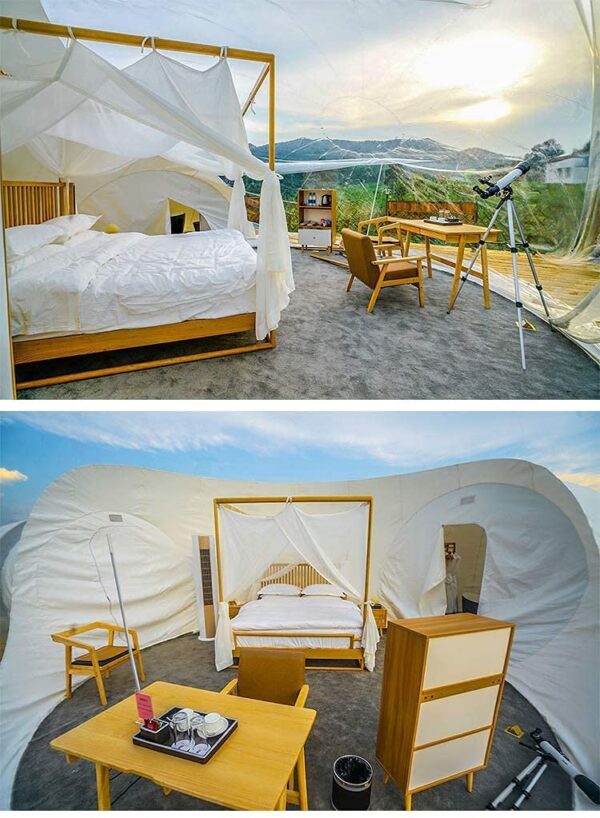 La tente Bubble est la demeure extérieure ultime. Créez votre propre hôtel de plein air de luxe chez vous ou où que vous soyez. Amenez-le en camping, à votre prochain festival de musique, observez les étoiles ou laissez-le simplement dans la cour pour votre plaisir! nos tentes à bulles sont en PVC épais de haute qualité